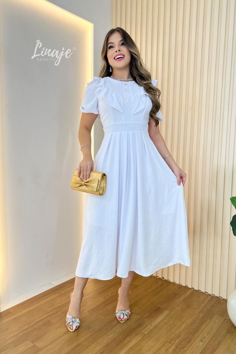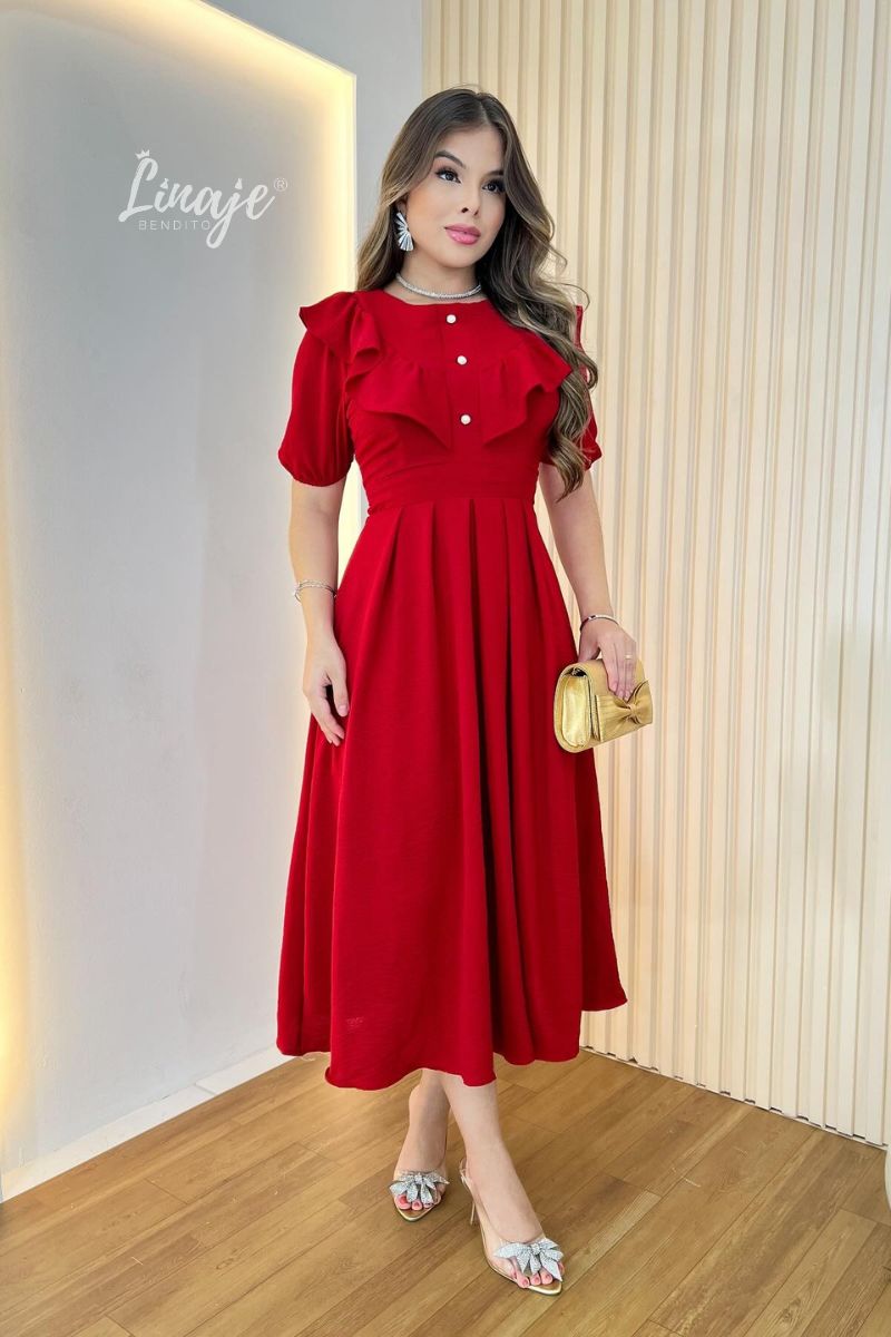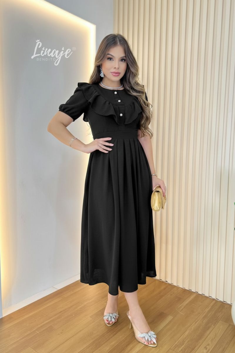 Este hermoso vestido con delicados volantes en la parte superior añade un toque romántico y sofisticado, mientras que los botones decorativos aportan un detalle fino y distintivo.